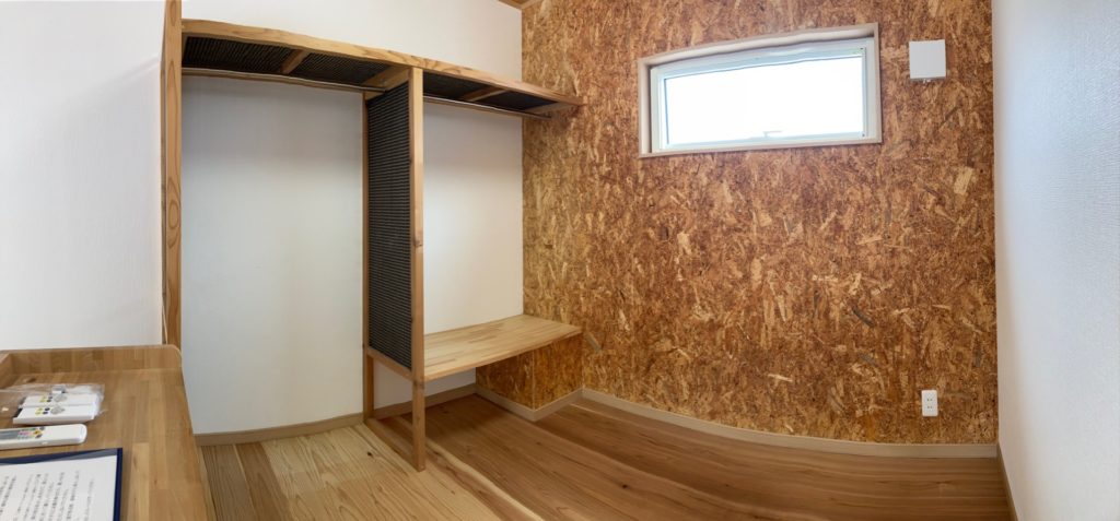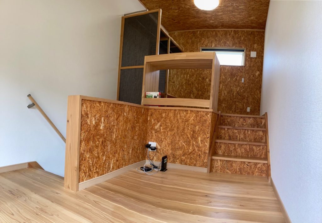 2階建の縦の空間に4層の床が重層しているのが特徴です。玄関正面の一層目は、バス・トイレ、シャンプードレッサー洗面化粧台、洗濯機置場がオールインになったユーティリティルーム。玄関脇の階段を昇ると2層目はキッチンスペース、さらに階段を上ると、3層目の居間と4層目のベッドルームで縦空間のワンルームになっています。ベッドルームには備え付けの机とクローゼットが設置されています。