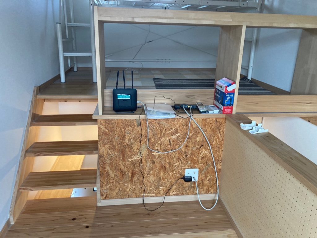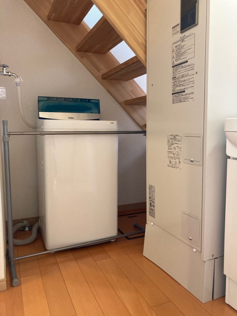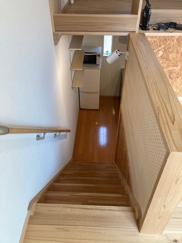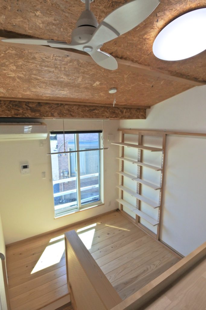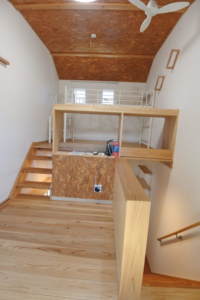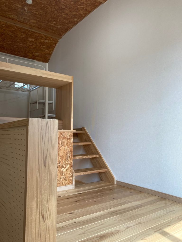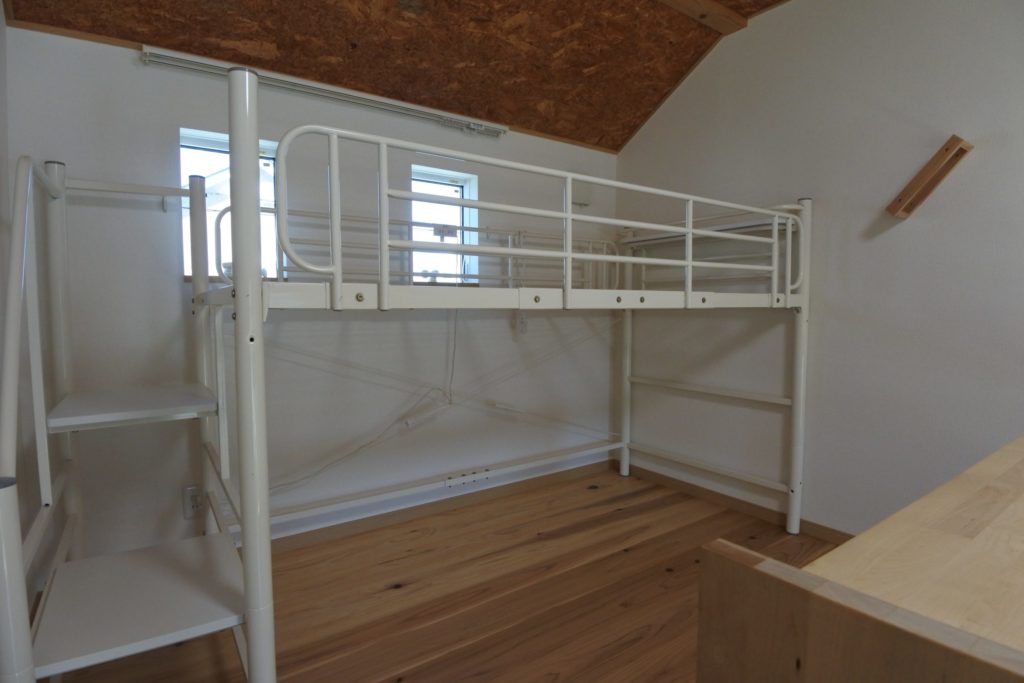 ◆玄関正面の一層目は、バス・トイレ、シャンプードレッサー洗面化粧台、洗濯機置場がオールインになったユーティリティルーム。玄関脇の階段を昇った2層目はキッチンスペースで冷蔵庫が置けます。さらに階段を上ると、3層目の居間と4層目のベッドルームで縦の空間でワンルームを構成ベッドルームには備え付けのロフトベッドと机が設置されています。